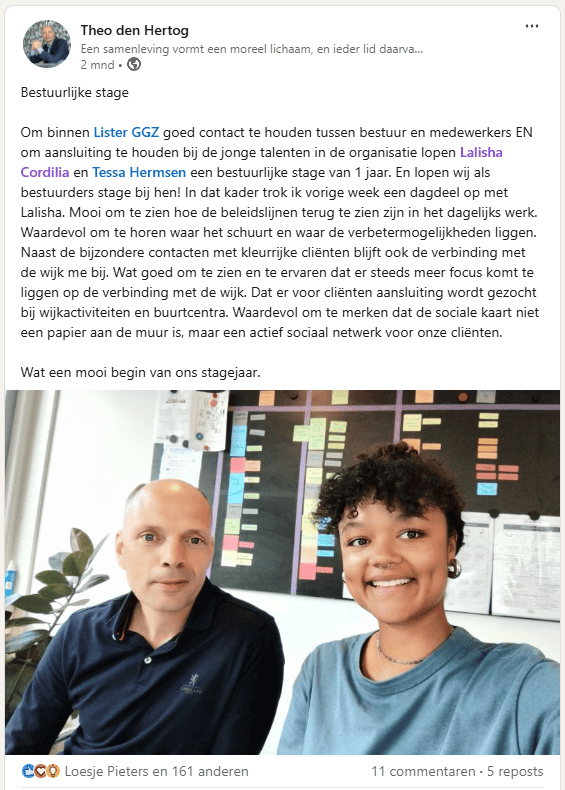 Al sinds zijn aanstelling – ruim 5 jaar geleden – loopt Theo regelmatig mee met collega’s van Lister. Dit jaar probeert hij via de bestuurlijke stage elke maand mee te lopen met Lalisha en Tessa. “Zo zie ik alles met eigen ogen, in plaats van dat ik het alleen op papier meekrijg. Dit levert veel meer op dan een nota lezen. Ik hoor direct wat de mitsen en maren rondom bestuurlijke besluiten zijn, en zie, hoor en voel waar onze collega’s echt blij van worden.” De stage bewijst zijn waarde: “Als bestuurder probeer ik altijd drie dingen mee te nemen in elk overleg: wat is het perspectief van de cliënt, wat beslissen we voor medewerkers, en wat betekent dit voor de organisatie? Deze bestuurlijke stage dwingt me ook om hier nog nadrukkelijker bij stil te staan.”